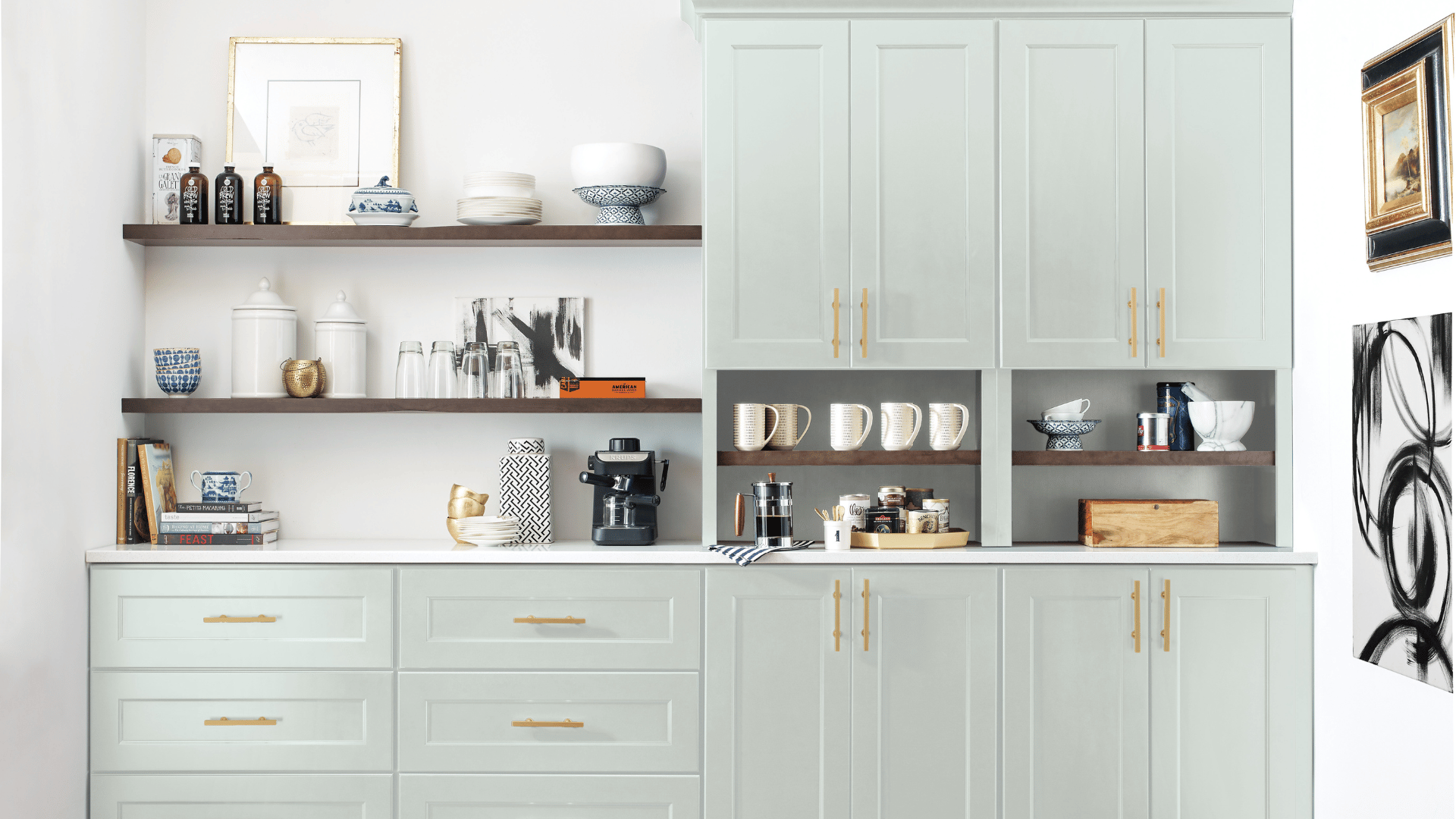 This butler’s pantry showcases our Renner door style in the Morning Mist finish, a subtle light blue that captures the crisp, clean feeling of a quiet start. Its light, airy tone pairs beautifully with natural wood accents, creating a refined yet inviting space that blends function with timeless design.